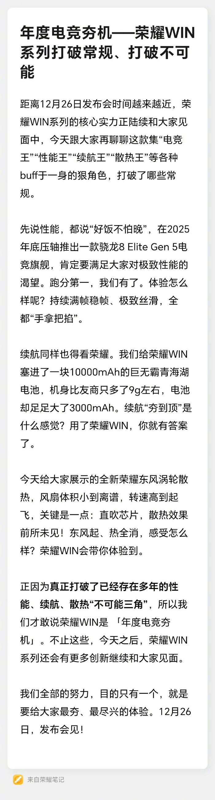 #荣耀WIN年度电竞最夯机#看职业选手一诺在预热视频里闪现救场,亮出每分钟25000转的“隐藏神装”,就知道发烫卡顿的时代过去了。现在#荣耀发布会#官宣,这套“荣耀东风涡轮散热系统”确实猛!它不仅有超高转速,更通过“独家双360°环绕风扇+直驱疾冷风道”的独家设计,直吹芯片热源,实现主动无死角的强劲散热。真正做到久玩不烫手、团战不掉帧。散热“夯到顶”,才能让#荣耀WIN#的第五代骁龙8至尊版芯片和185Hz高刷屏的性能火力全开,配合10000mAh青海湖电池,从早赢到晚,体验彻底赢麻了!这一波冷静输出,你确定不冲吗?
