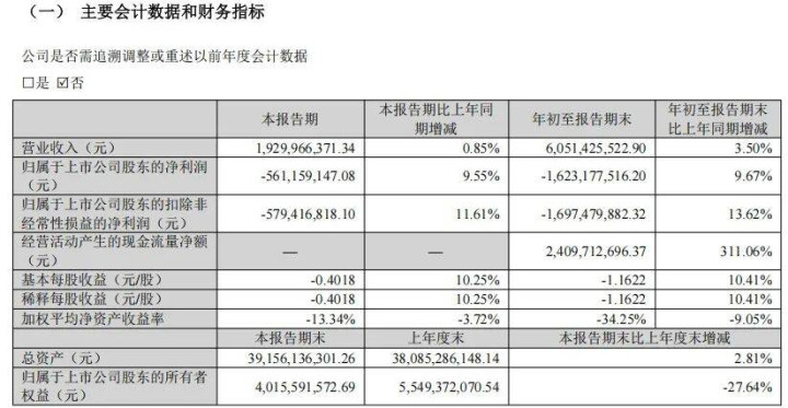 扣除非经常性损益-16.97亿元的净利润,同比上升13.62%。单季度来看,第三季度归母净利润为-5.61亿元,同比减亏近6000万元。