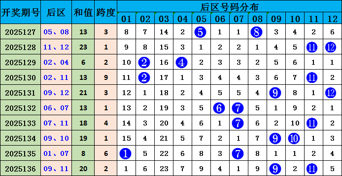 后区分析:上期后区开出号码09、11,为大大奇奇组合。