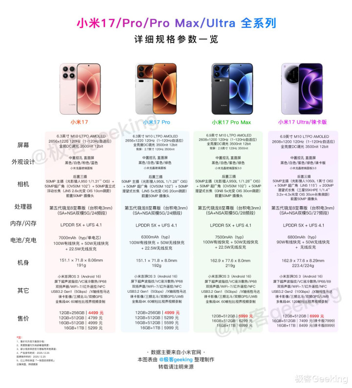 依然惯例,关于刚发布的小米17 Ultra/徕卡版,极客君这次依然带来了「一张图总结手机配置」,小米17 全系列这四款新一代旗舰手机的外观、详细配置参数和售价尽在这张总结图表了,数据持续维护和更新。