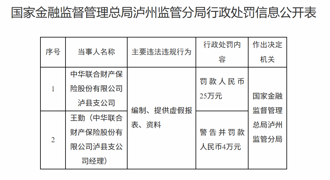 3月3日,国家金融监督管理总局泸州监管分局行政处罚信息公开表显示,中华联合财产保险股份有限公司泸县支公司因编制、提供虚假报表、资料被罚款人民币25万元。责任人王某被警告并罚款人民币4万元。