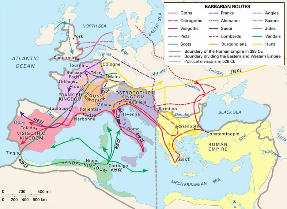 此后的几十年里,匈奴人、哥特人、汪达尔人、法兰克人、盎格鲁—撒克逊人、勃艮第人、伦巴第人轮流入侵西罗马帝国,意大利多次遭到洗劫。公元476年,末代皇帝罗慕路斯遭到废黜,西罗马帝国正式灭亡。在此后的几百年里,西欧进入“黑暗时代”,各大蛮族纷纷在西帝国的旧址上建立王国。不过西帝国虽然灭亡,但其文化却伴随基督教的传播得以保留下来,融合为西方文明的一部分。